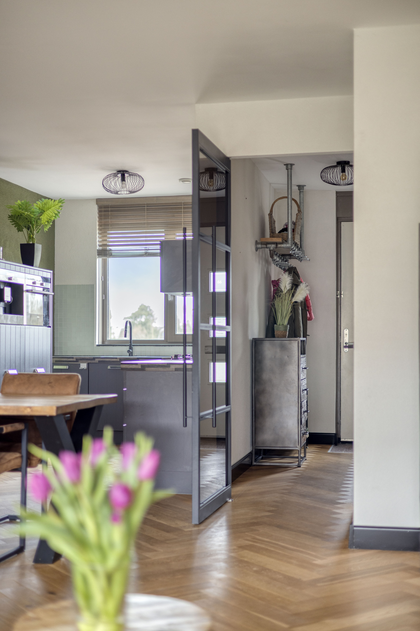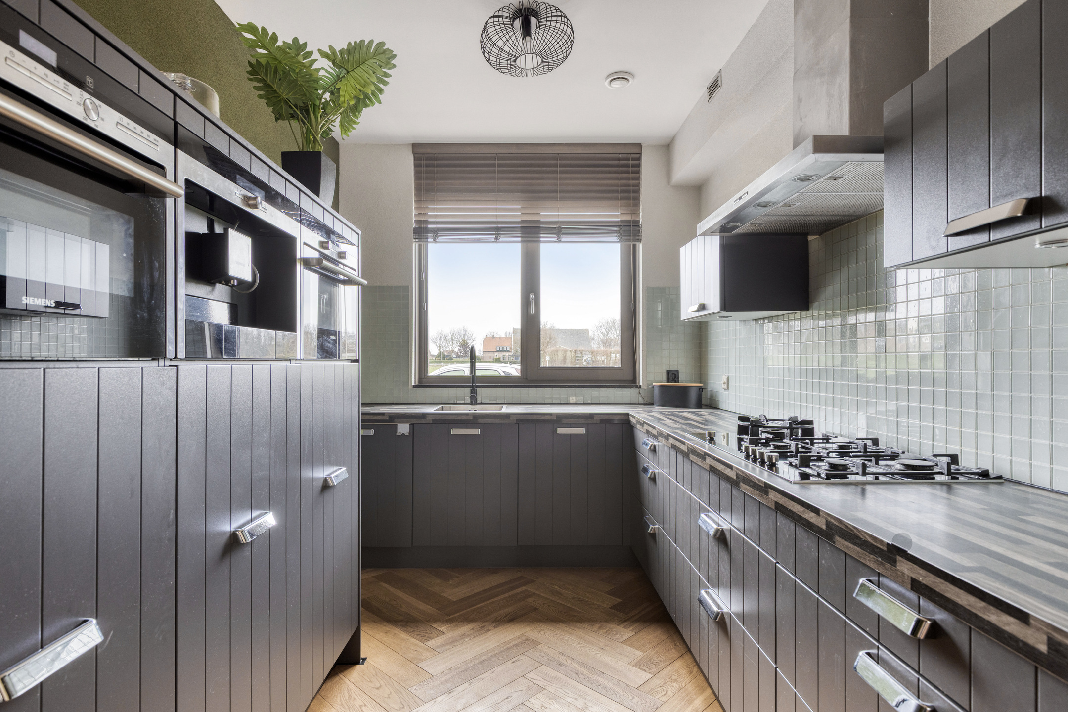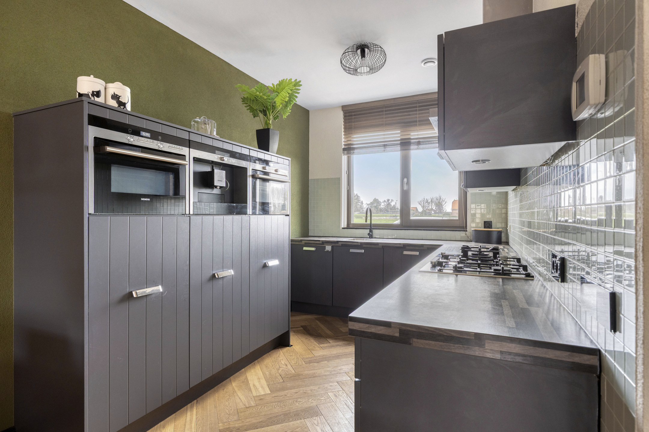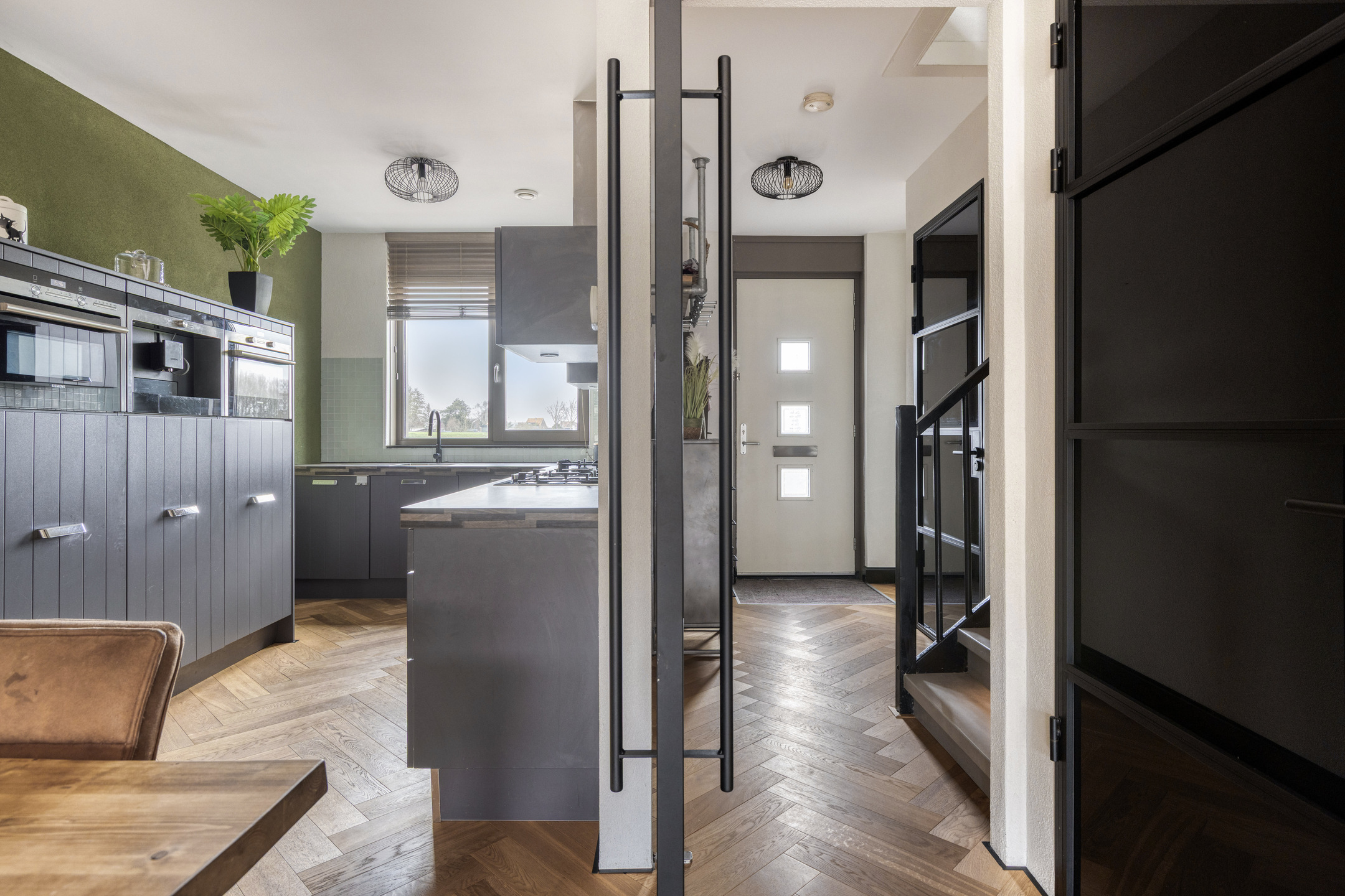Begane grond: entree/hal met meterkast en modern toilet v.v. vrijhangend closet en handwasbakje; grote tuingerichte woonkamer met trapkast, airconditioning en een aanbouw v.v. openslaande tuindeuren en een elektrische bedienbare buitenzonwering; halfopen keuken aan de voorzijde met vrij uitzicht op polderlandschap, met moderne opstelling bestaande uit een hoekopstelling v.v. vaatwasmachine, breed gaskomfoor (4 pits plus wokbrander) en afzuigkap & een wandopstelling, v.v. 2 koelkasten, combioven, koffiezetapparaat en oven; woonkamer en keuken zijn samen 42 m2; de begane grond is modern afgewerkt met een houten vloer (visgraat gelegd) v.v. hoofdvloerverwarming, glad gestuukte wanden en plafonds en fraaie stalen binnendeuren.
