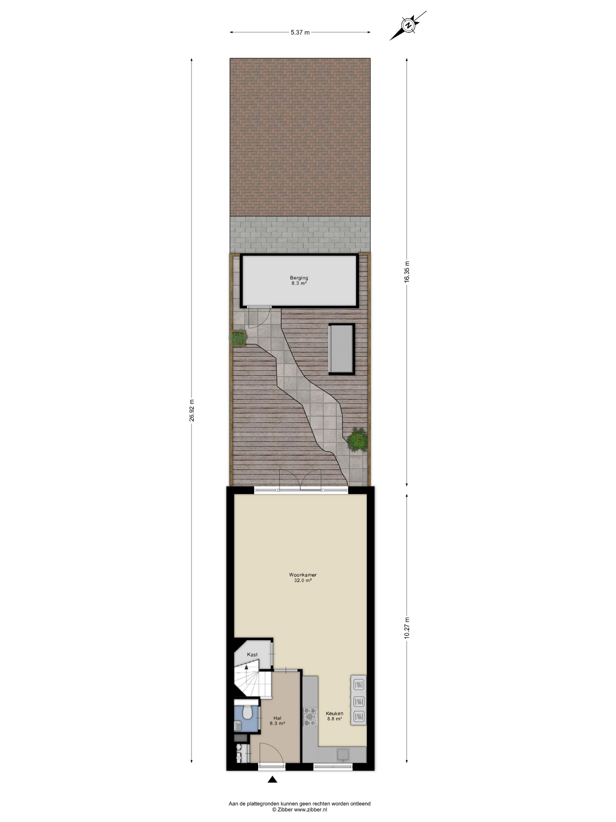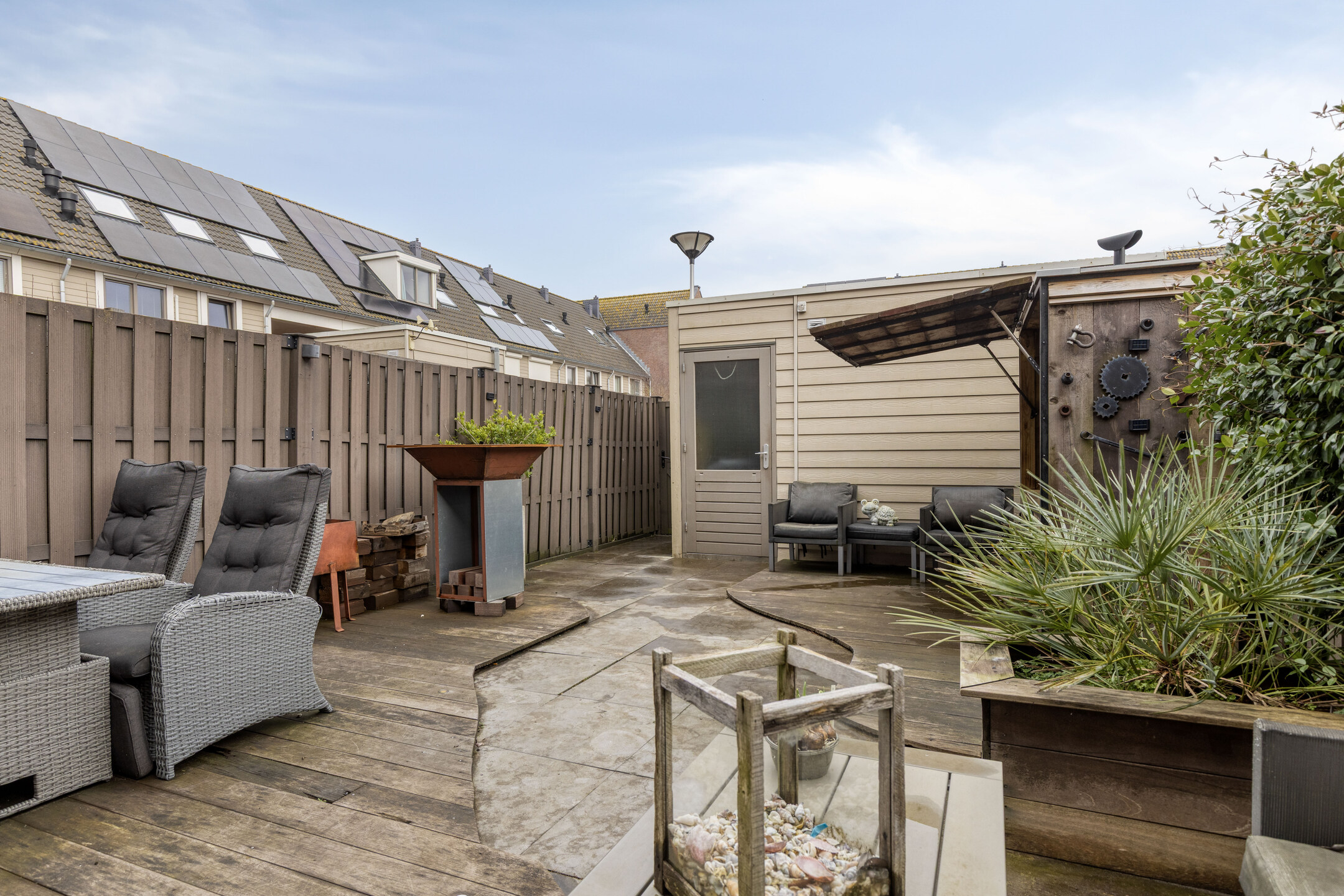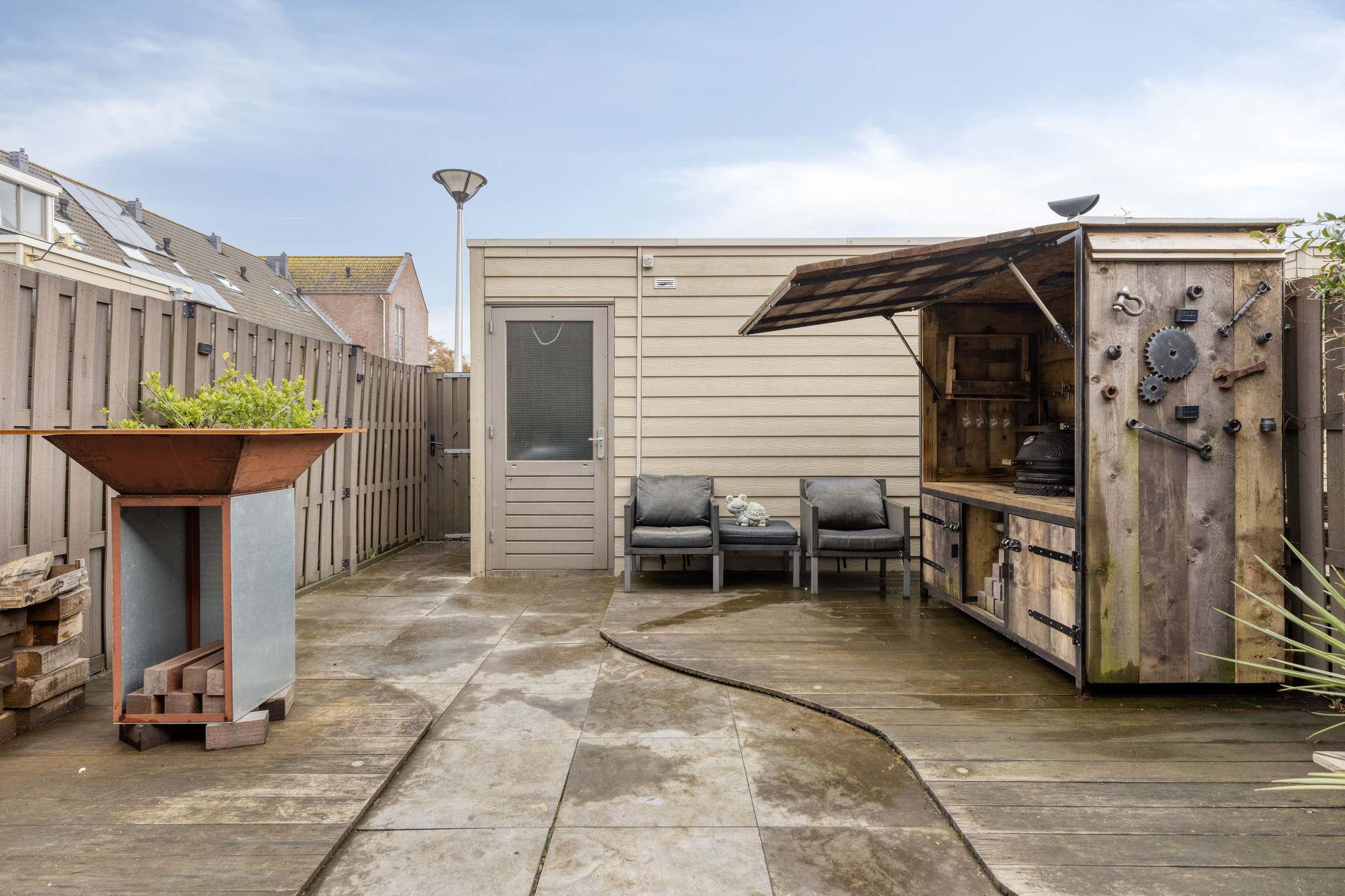 Achtertuin met zonnige ligging, bbq plaats, berging (vergroot) en 2 eigen parkeerplaatsen.