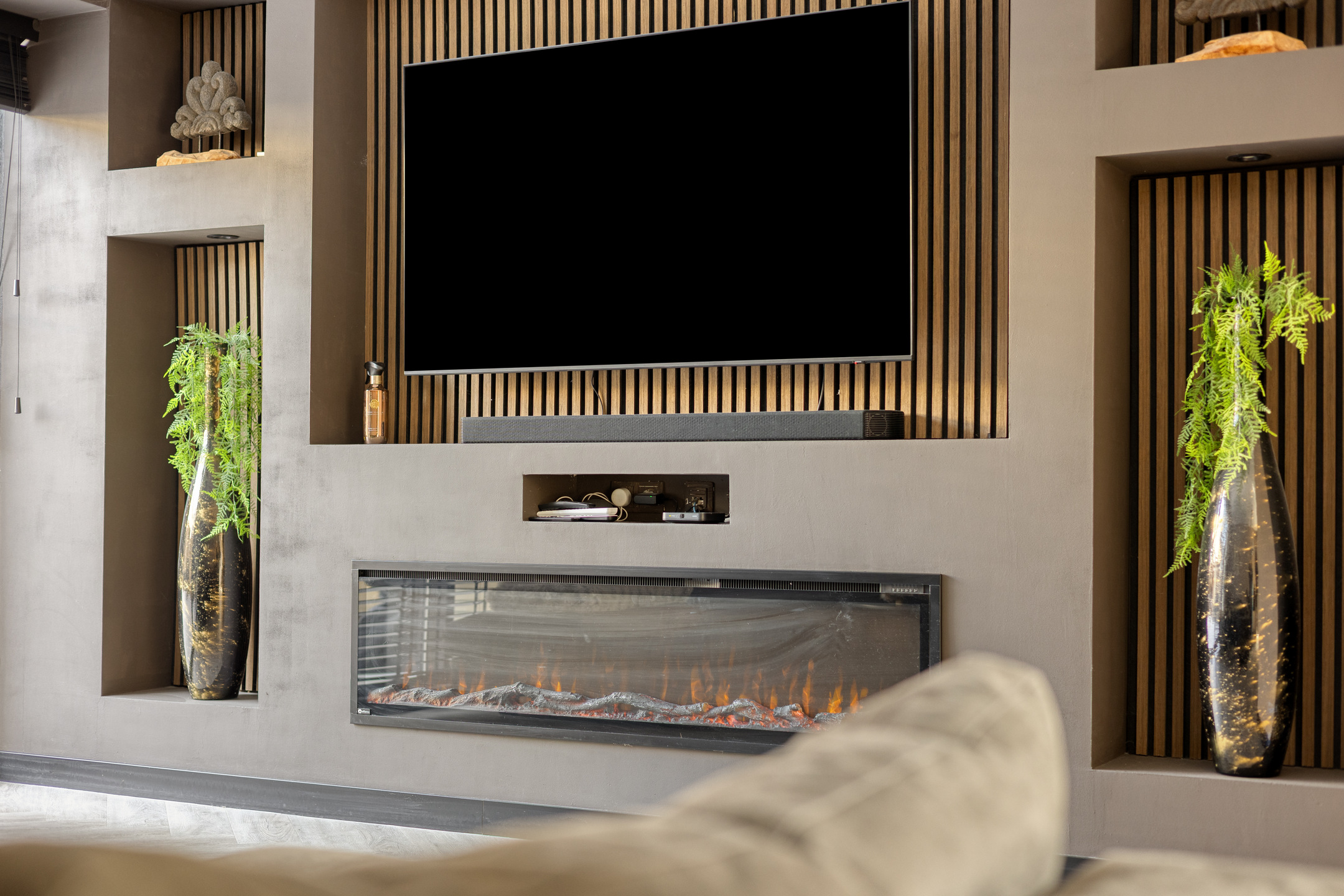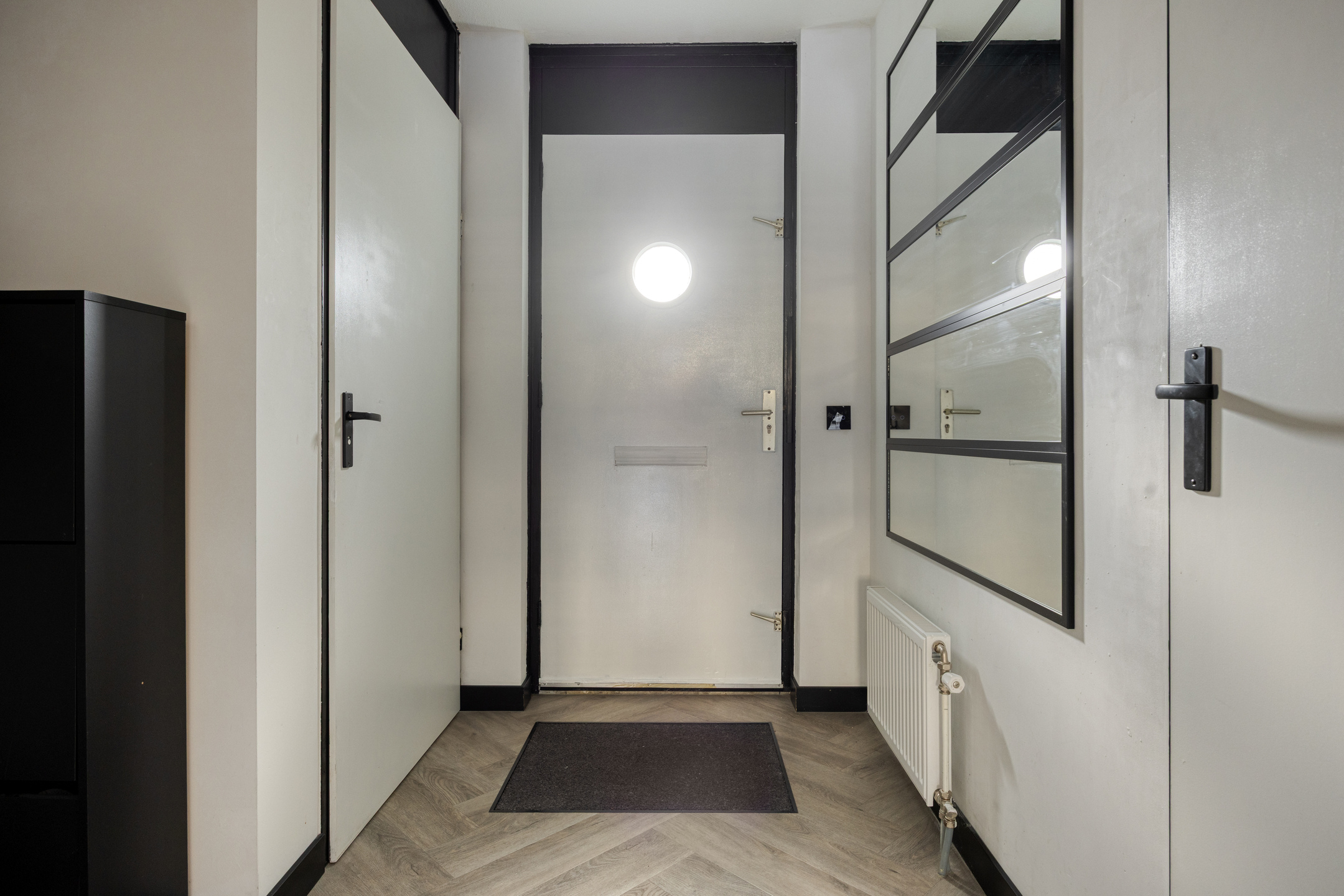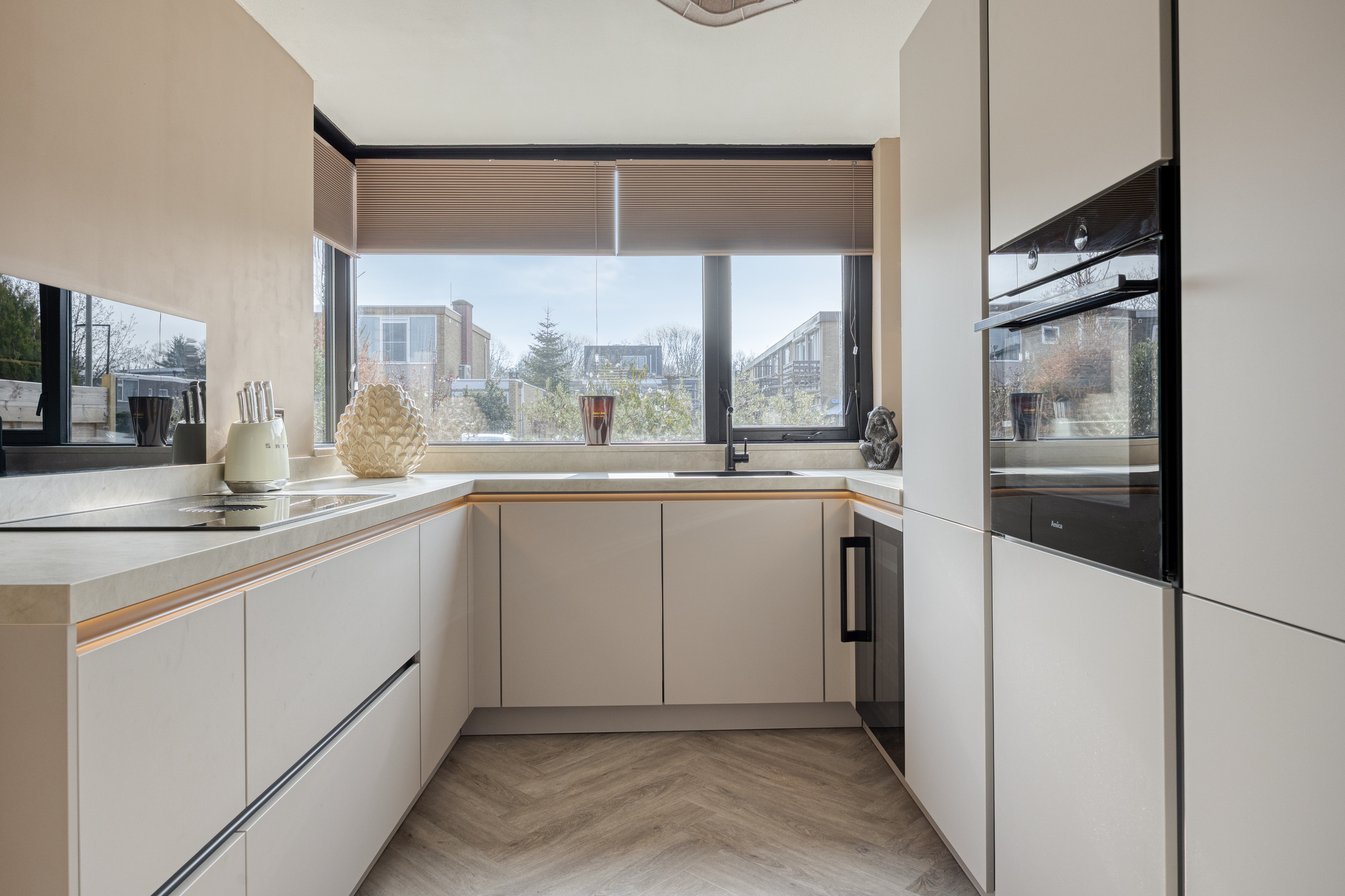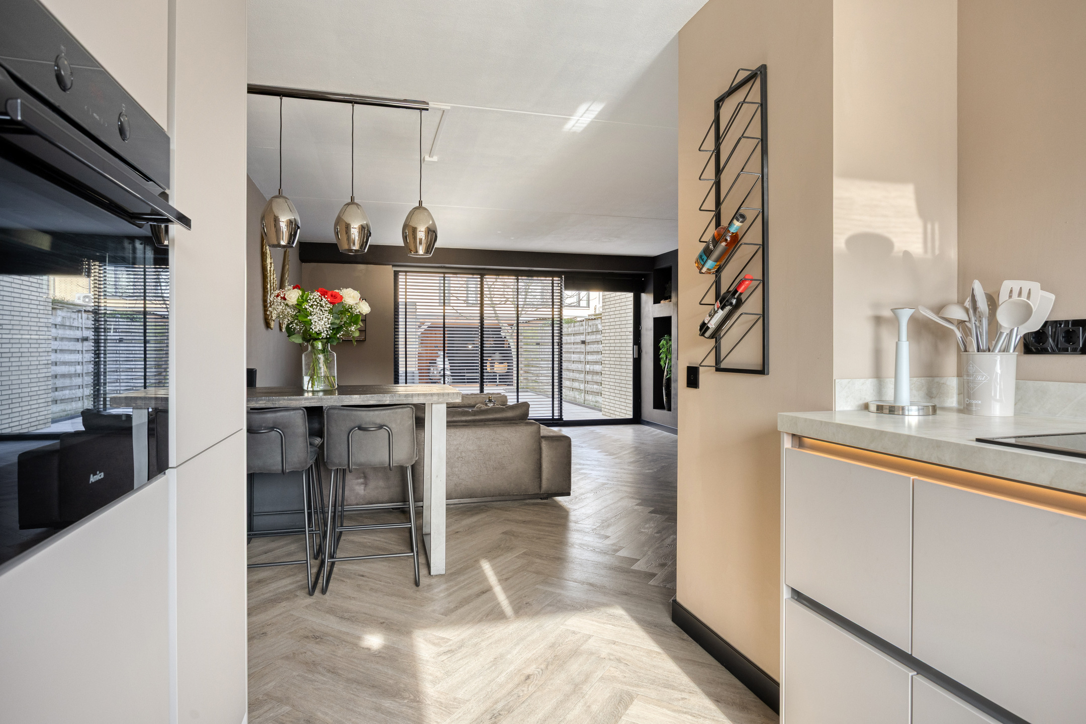 Begane grond: overdekte entree; hal met modern toilet v.v. vrijhangend closet, meterkast en trapopgang; ruime tuingerichte woonkamer met trapkast, fraaie cinewall v.v. ingebouwde elektrische haard, brede pui met schuifpui en inbouwverlichting; halfopen keuken met een gloednieuwe keukenopstelling (2026), bestaande uit een hoekopstelling met een aaneengesloten hoge wandopstelling v.v. inbouwapparatuur: hoge vrieskast, oven, hoge koelkast, wijnkast, vaatwasmachine en een inductiekookplaat met geïntegreerde afzuiging (Bora); de begane grond is afgewerkt met een pvc vloer v.v. hoofdvloerverwarming en glad gestuukte wanden.