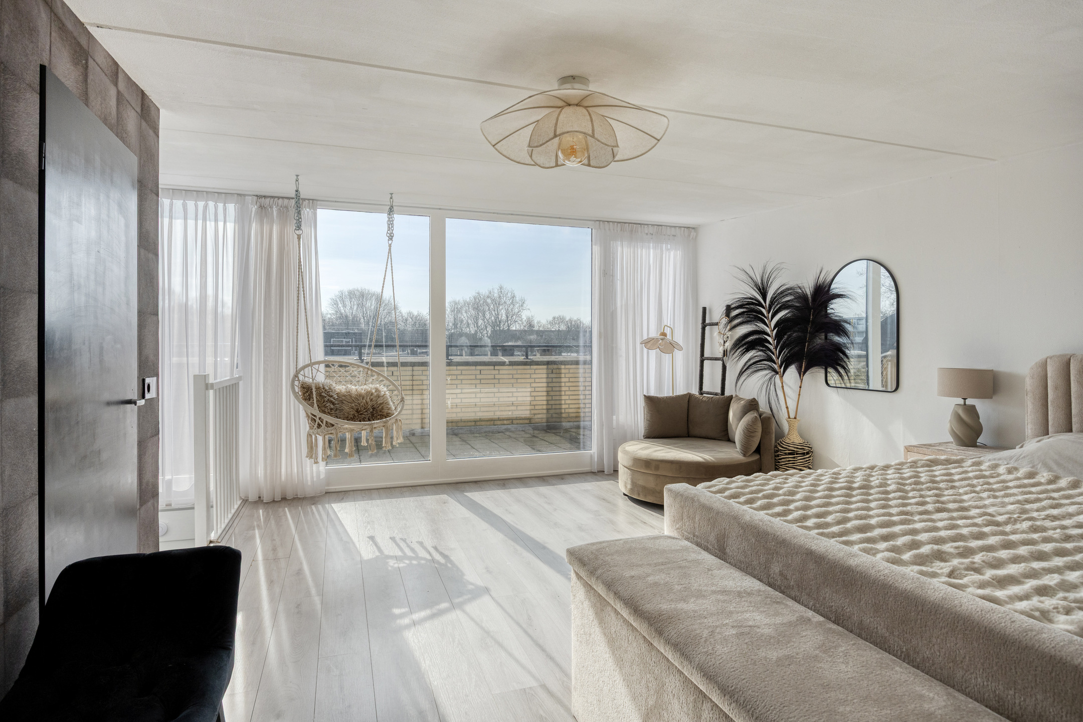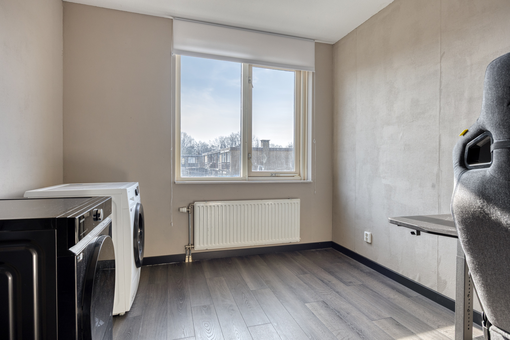 2e verdieping: royale 4e slaapkamer met airconditioning (2025), kledingkast en glazen pui v.v. deur naar het dakterras; technische ruimte met opstelling combiketel (2025) en unit mechanische ventilatie (2025); de 2e verdieping heeft rechte gevels en is afgewerkt met een laminaatvloer; ruim dakterras met gunstige zonligging.