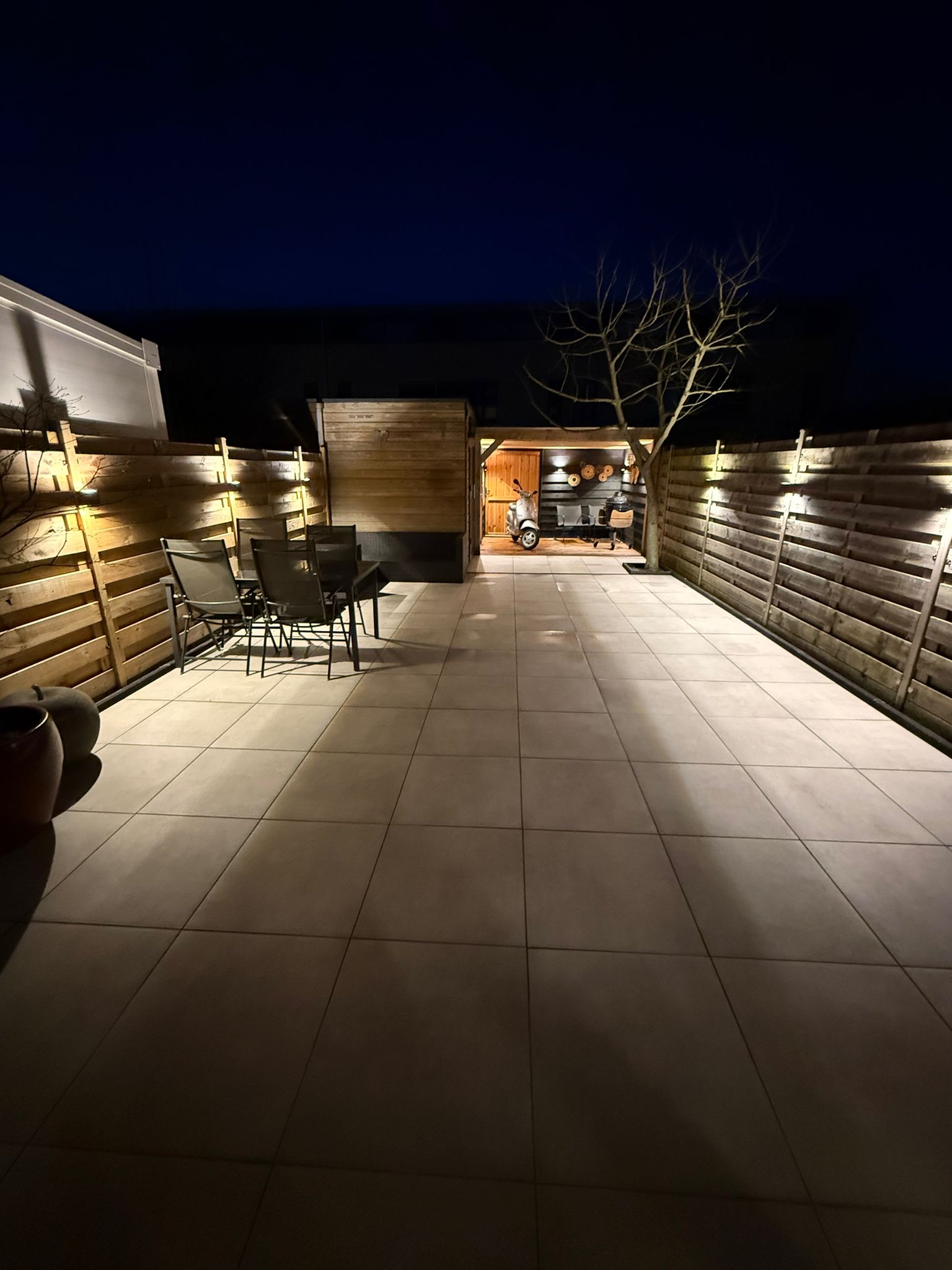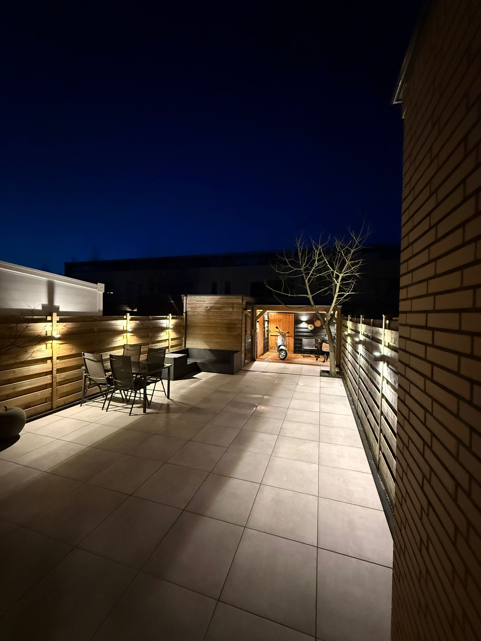 Voortuin. Diepe achtertuin (aangelegd in 2025) met tuinverlichting, overkapping, berging en achteruitgang.