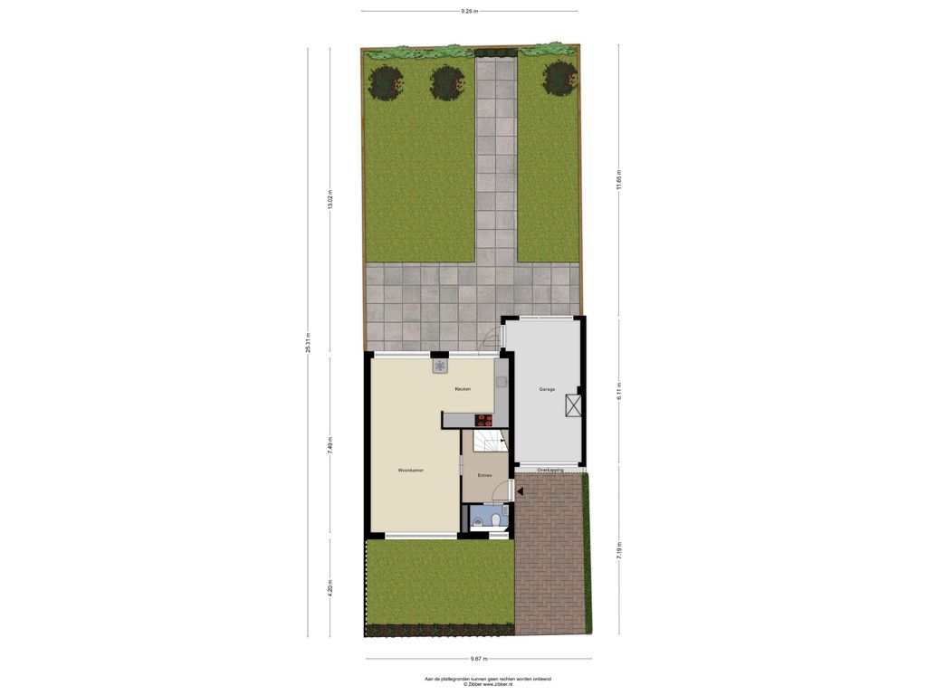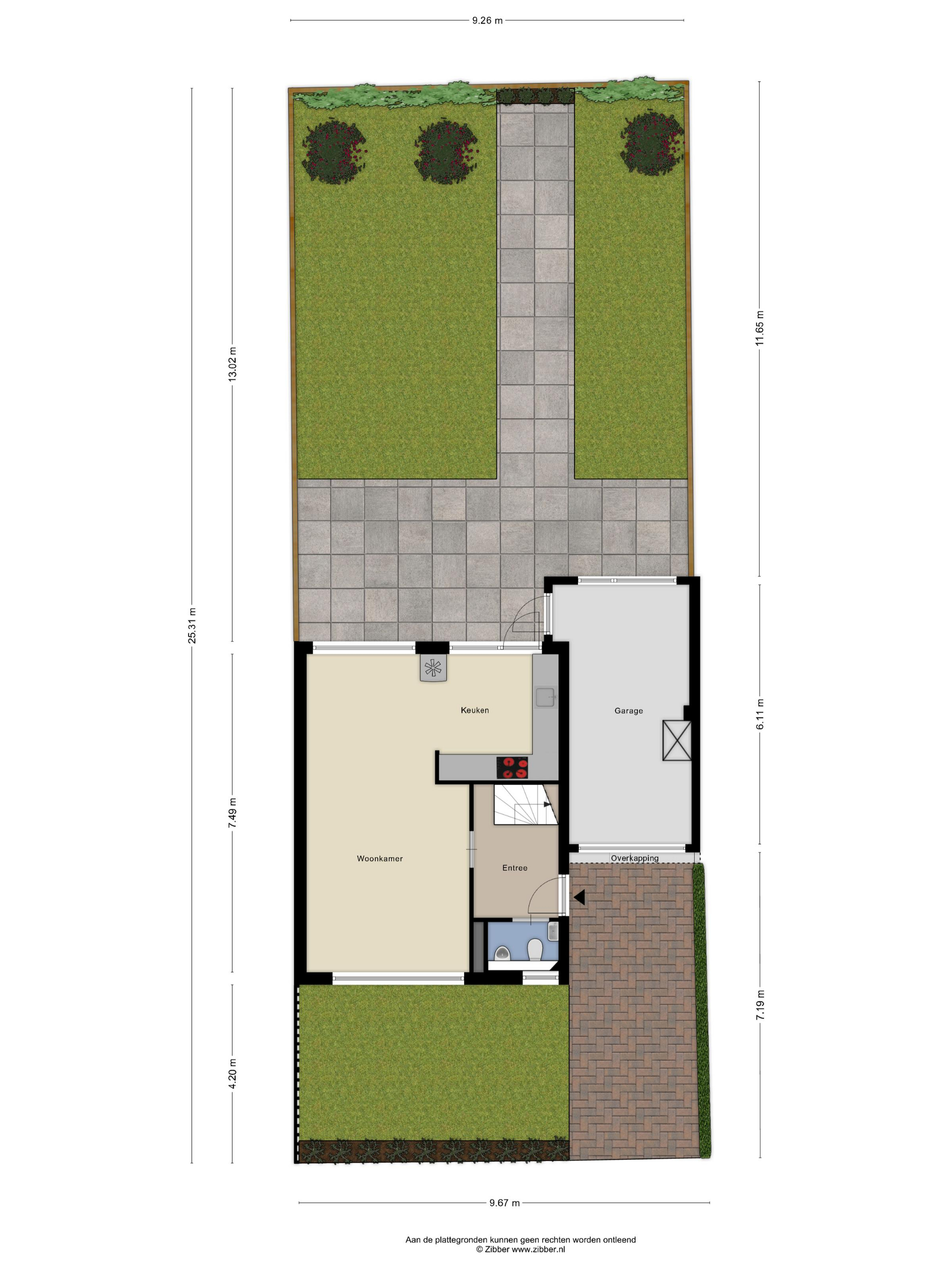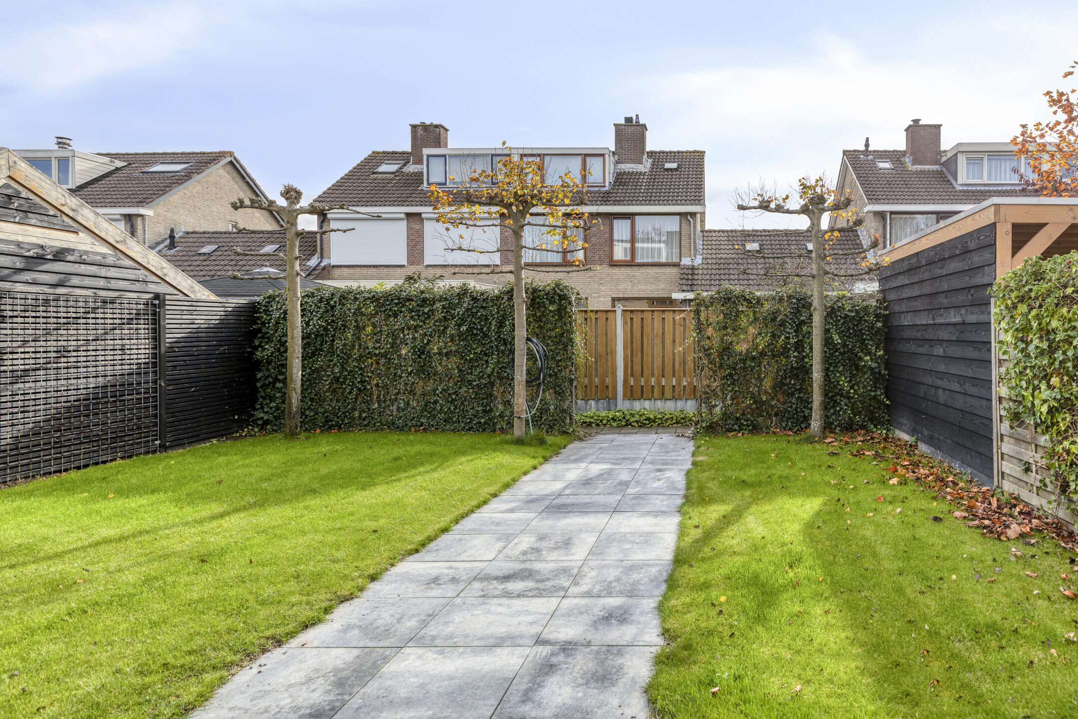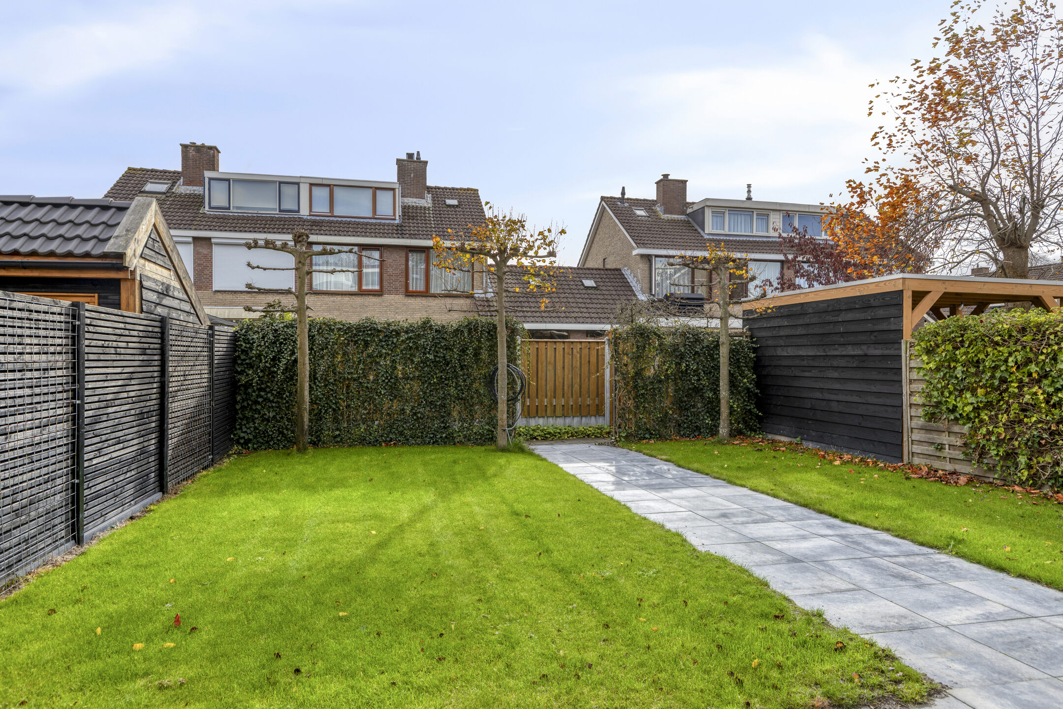 Voortuin met gazon en zijtuin met oprit/parkeerplaats voor de garage. Netjes aangelegde grote achtertuin, met onder meer gazon, een gunstige zonligging op het zuiden en een achteruitgang.