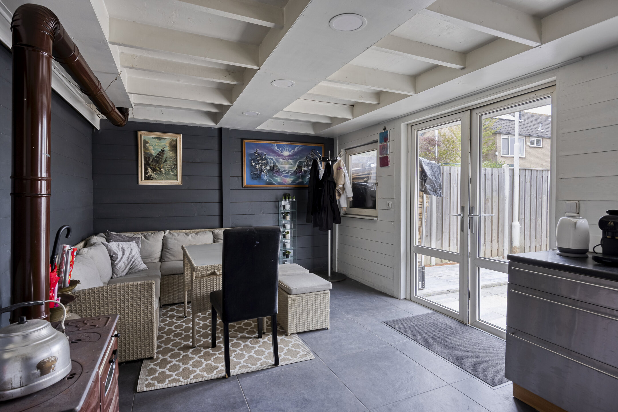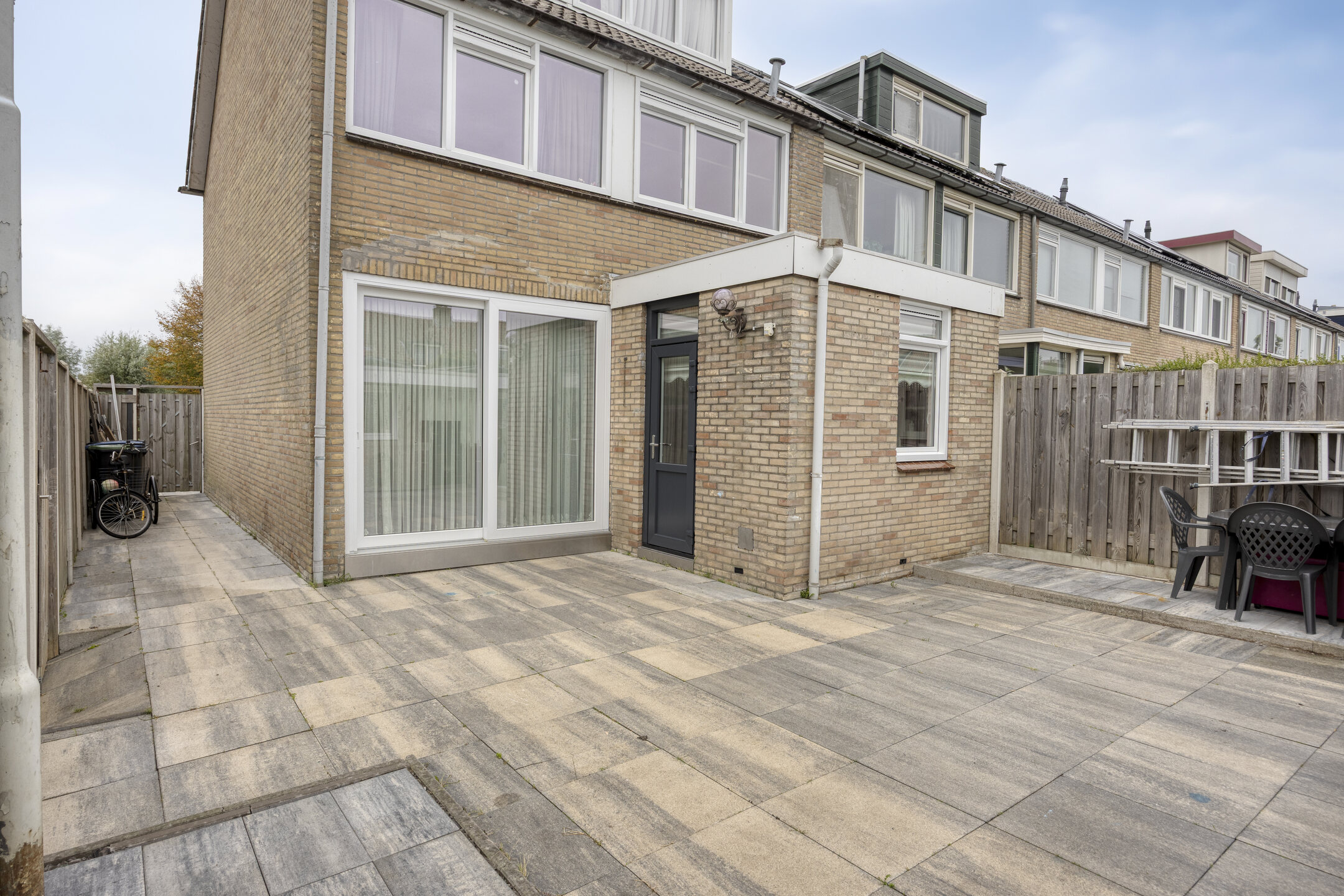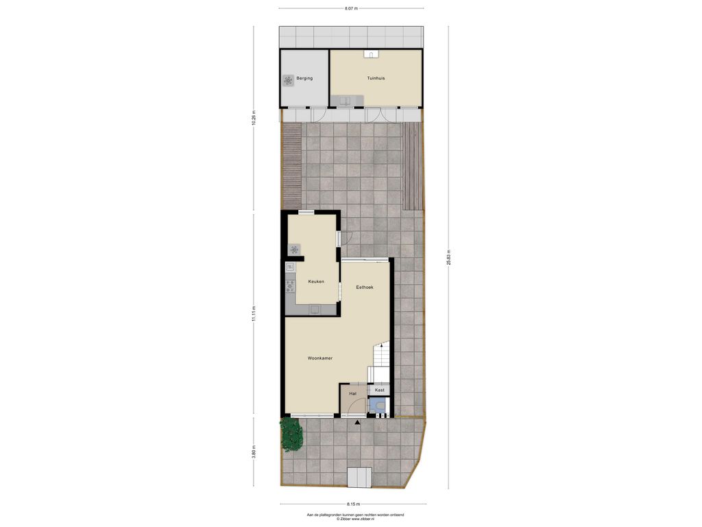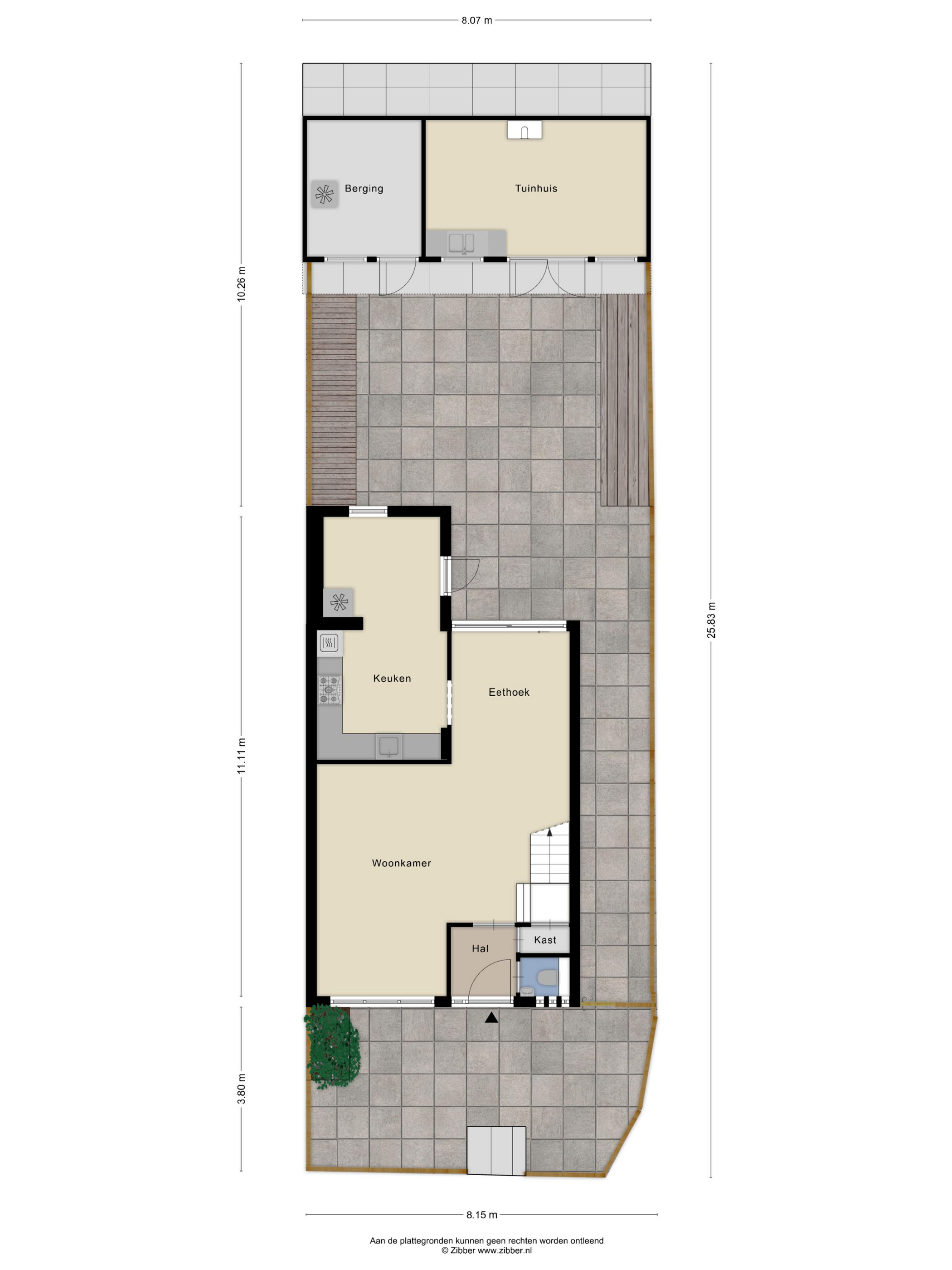 Voortuin, zijtuin en achtertuin, aangelegd met sierbestrating en erfafscheidingen. De achtertuin is ruim, heeft een gunstige zonligging op het zuiden en een berging waar een aanbouw / tuinkamer aan gerealiseerd is (totaal 25 m2) v.v. kunststof kozijnen (exclusief de deur van de berging).
