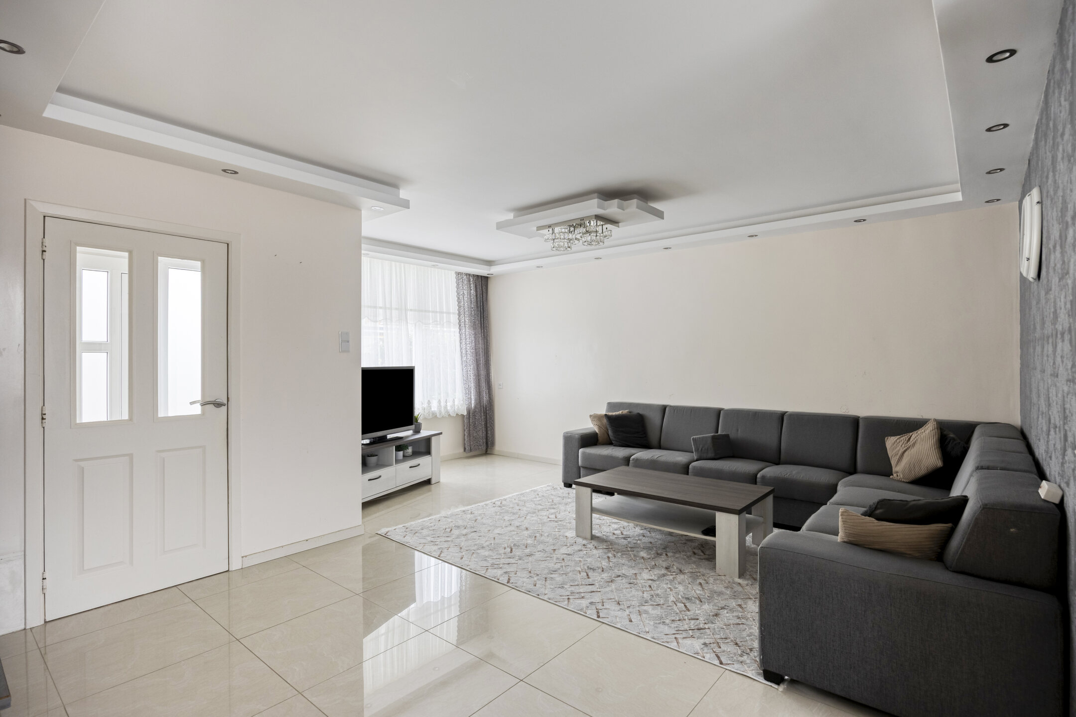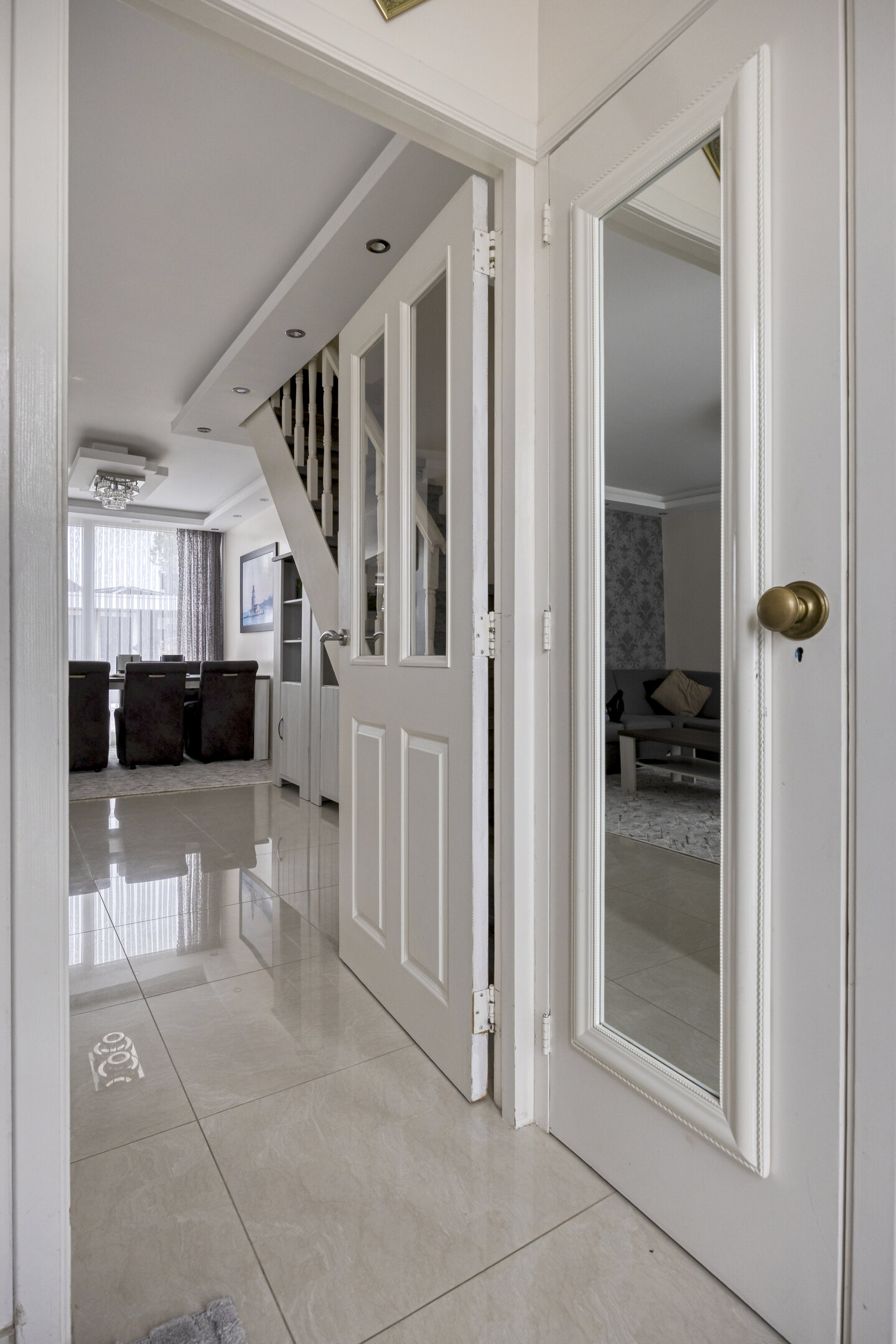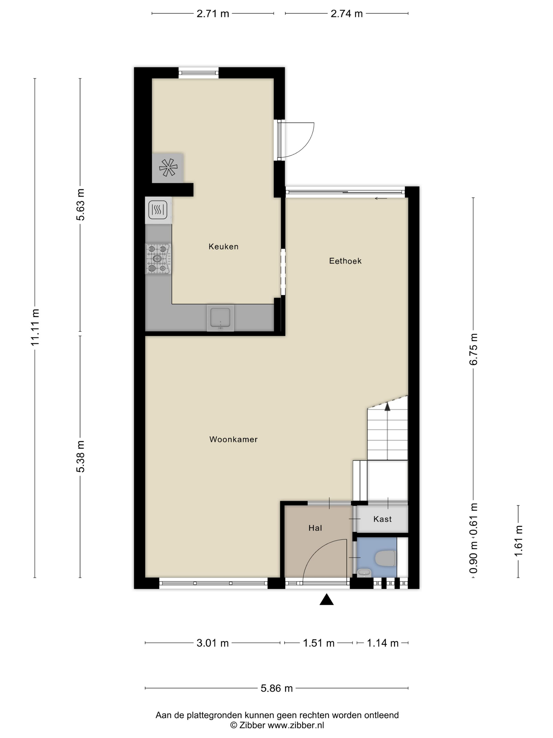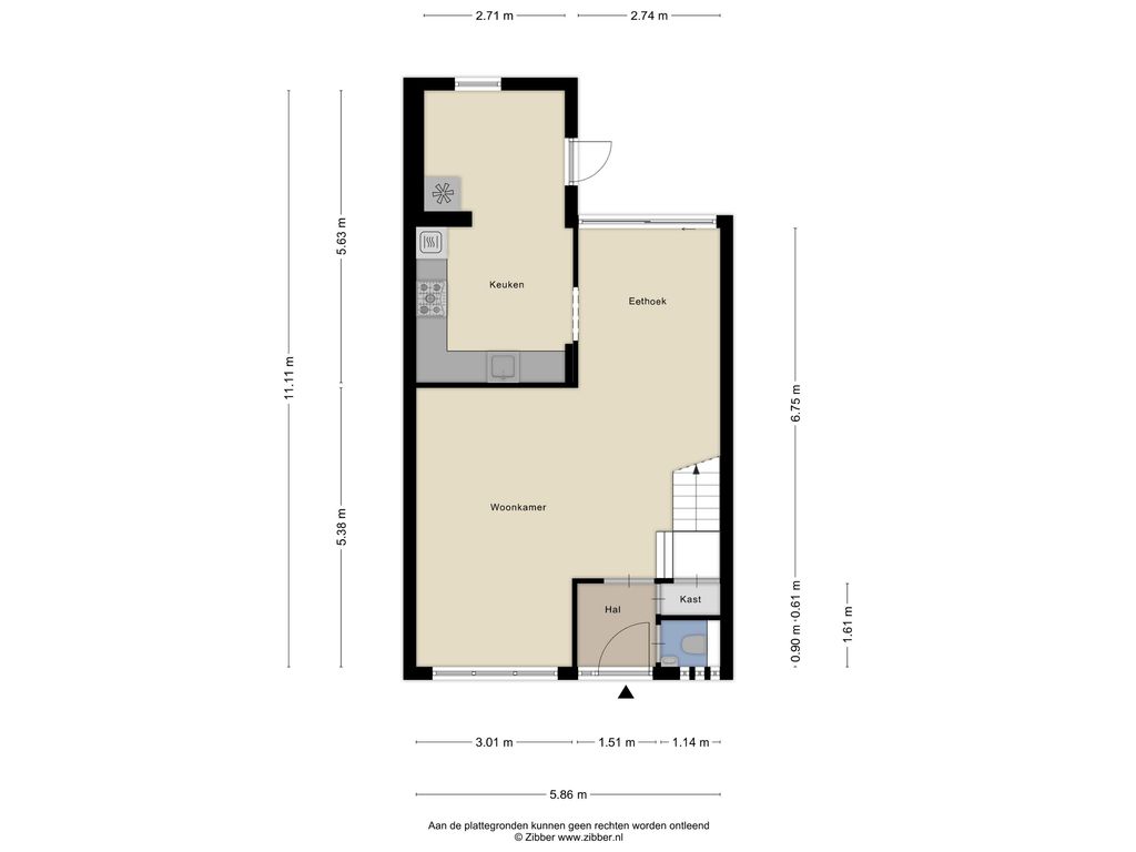 Begane grond: hal met modern toilet v.v. vrijhangend closet en meterkast (groepenkast met schakelaars); royale Z-vormige woonkamer van 35 m2, met ruimte voor de zithoek, ruimte voor de eethoek, schuifpui naar de achtertuin, trap naar de verdieping en vaste kast; grote keuken van 15 m2, met ruim opgezette moderne hoekopstelling v.v. inbouwapparatuur: vaatwasmachine, 5 pits gaskomfoor, brede afzuigschouw en combioven, de keuken is uitgebreid middels een aanbouw aan de achtergevel v.v. separate tuindeur; de begane grond is modern afgewerkt met een plavuizen vloer v.v. hoofdvloerverwarming, glad gestuukte wanden en glad gestuukte plafonds, met verlaagde delen v.v. inbouwverlichting.