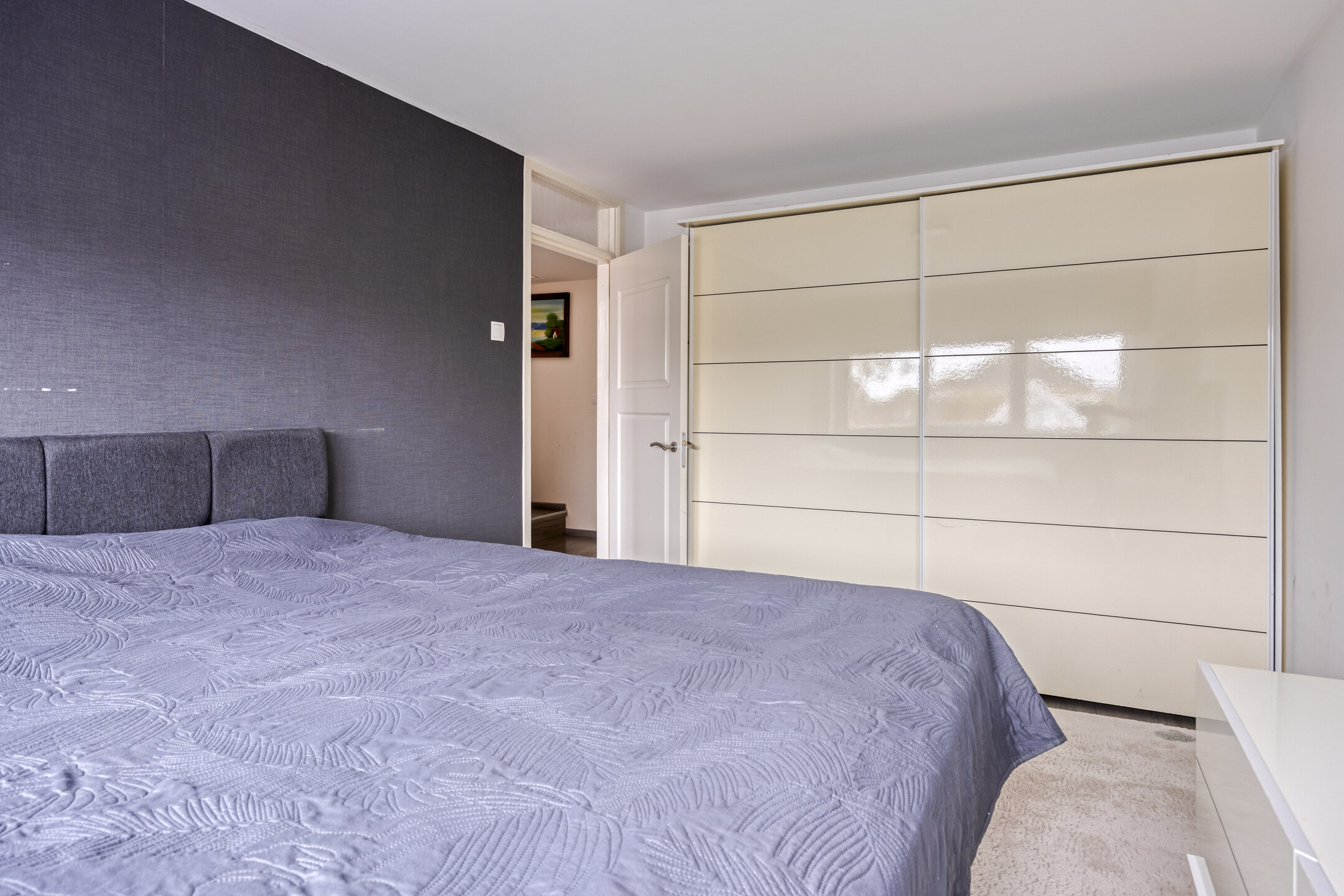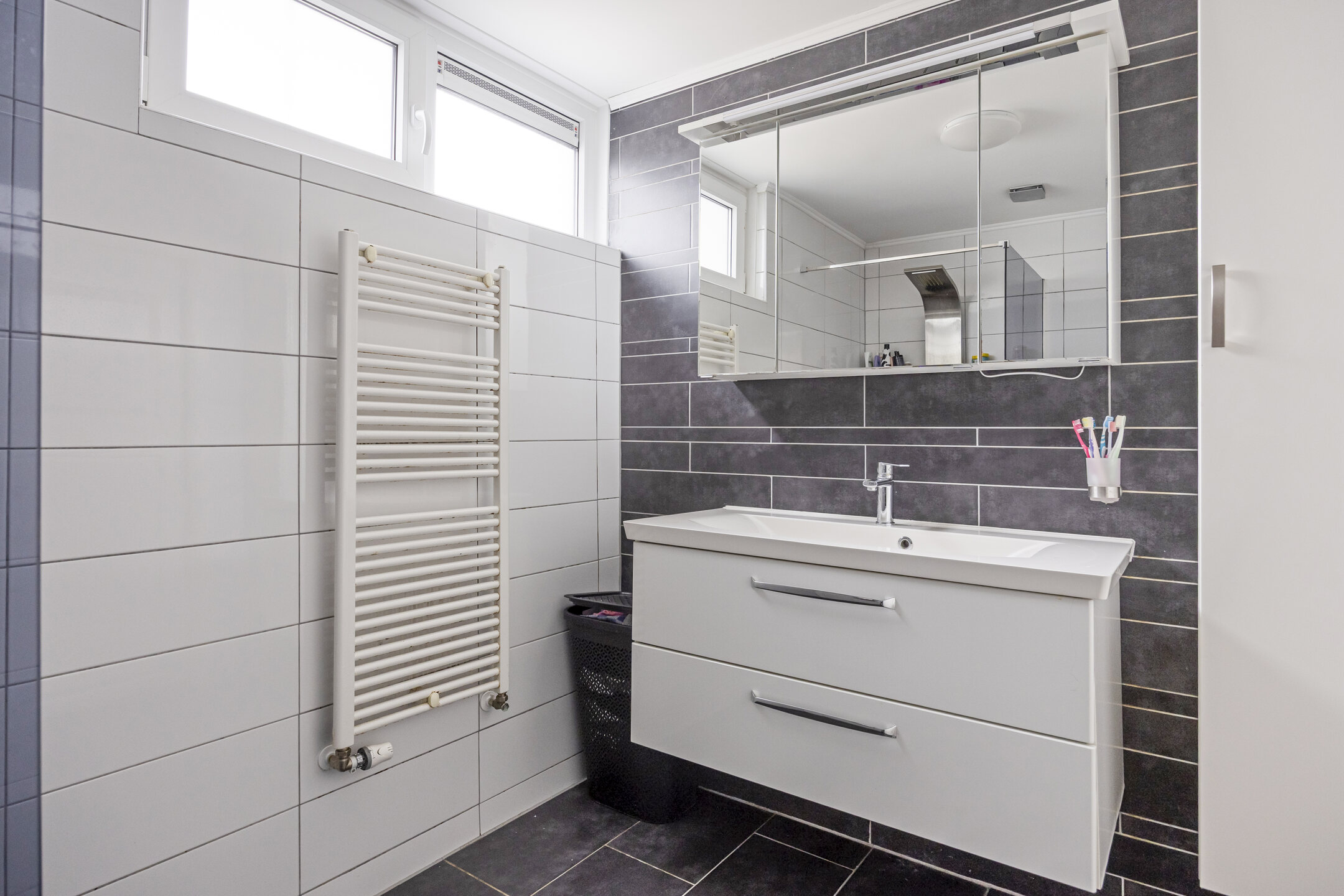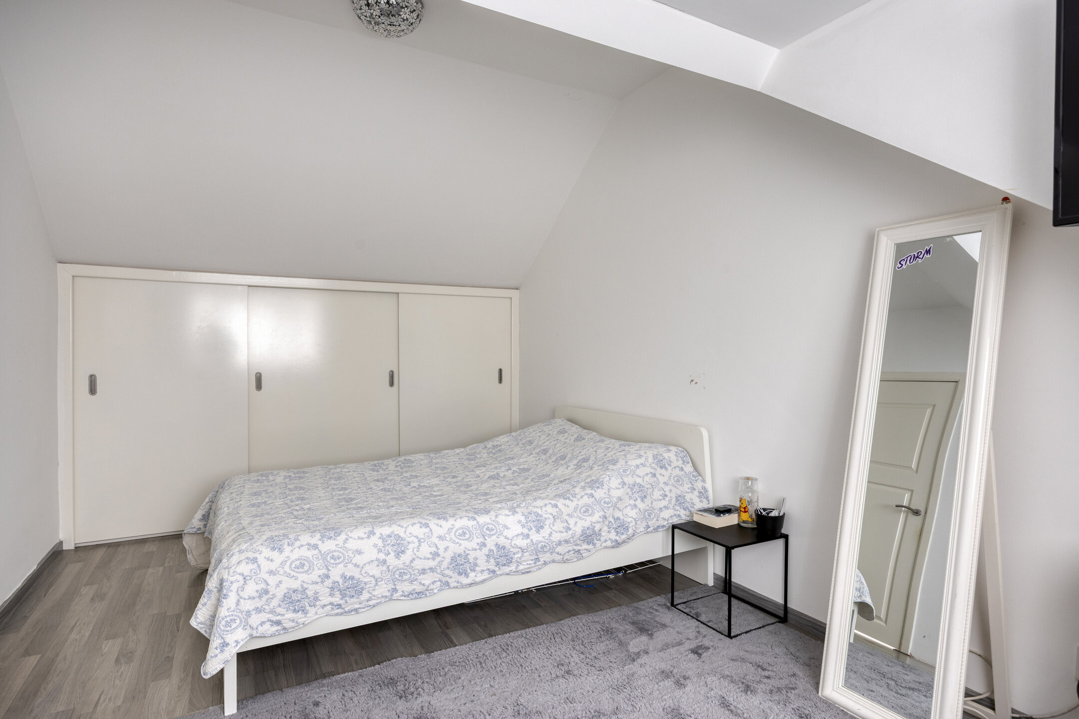 1e verdieping: ruime overloop; achterslaapkamer van 8 m2; ruime achterslaapkamer van 13 m2; ruime voorslaapkamer van 12 m2; ruime moderne badkamer met inloopdouche, vrijhangend 2e toilet, designradiator en wastafelmeubel; de 1e verdieping heeft rechte gevels en is modern afgewerkt met laminaatvloer, grotendeels glad gestuukte wanden en glad gestuukte plafonds