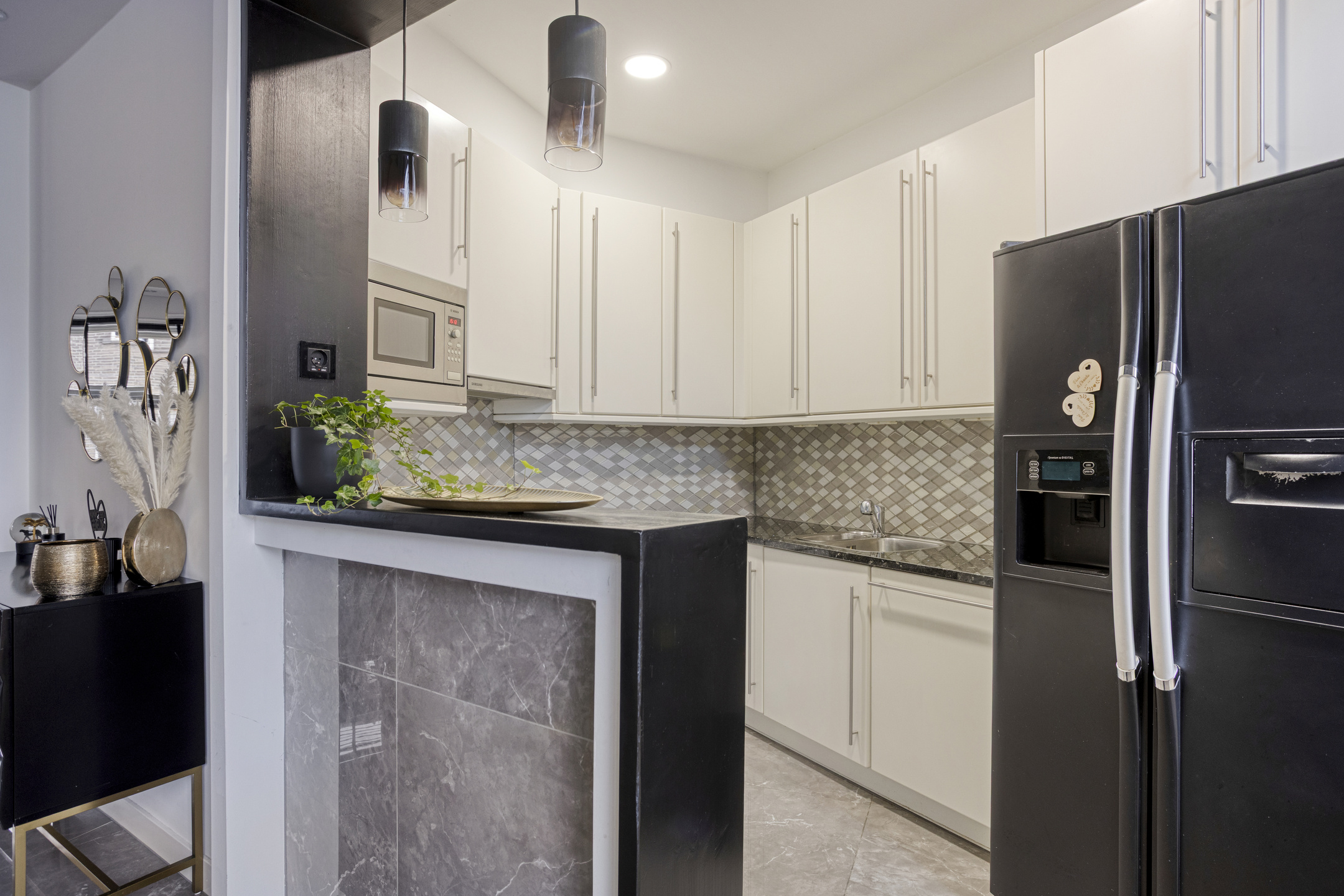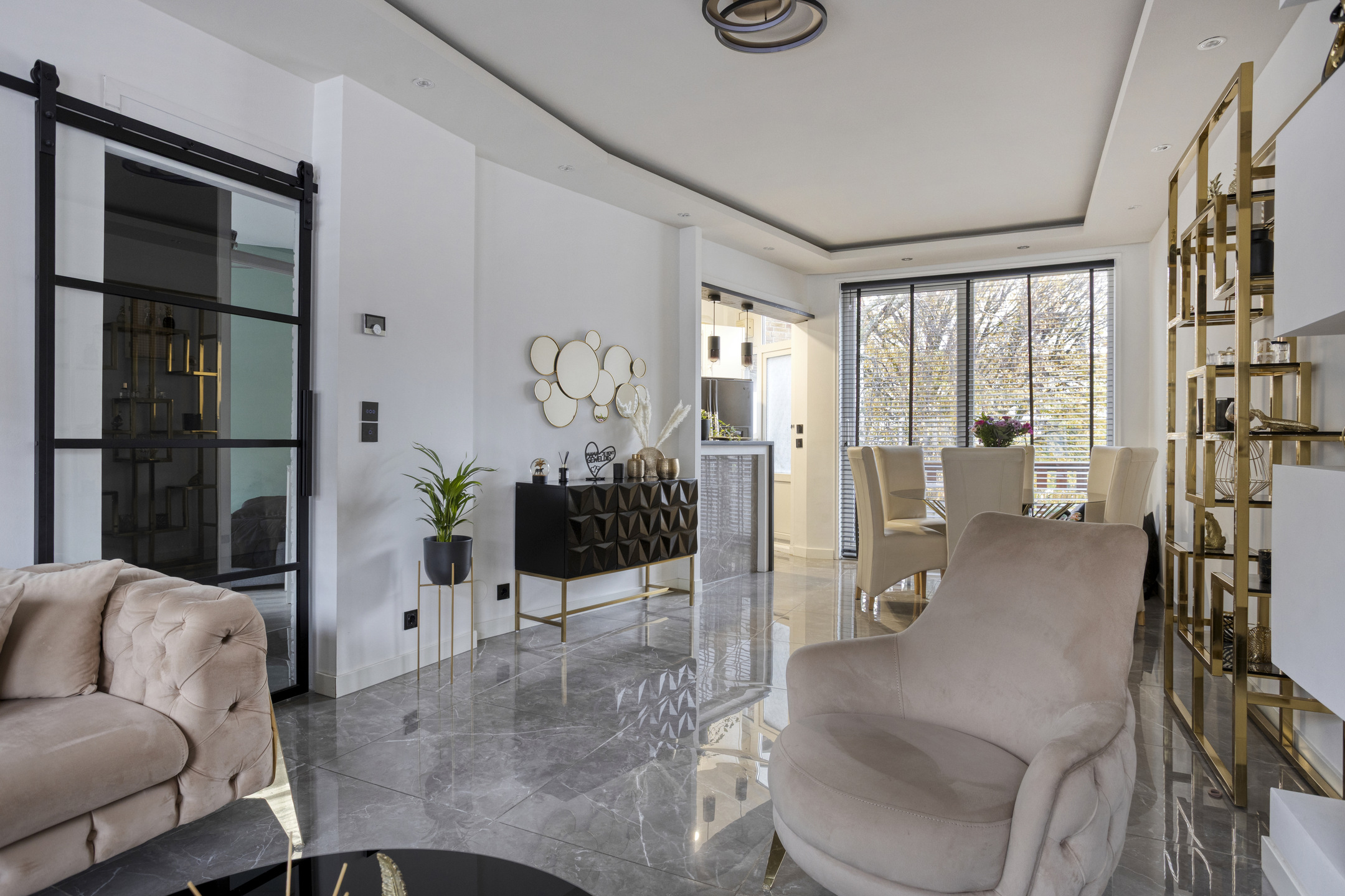 1e woonlaag: overloop/gang met ruim toilet en toegang tot een slaapkamer en de woonkamer (stalen deur); grote slaapkamer van 11 m2, met toegang tot een separate praktische ruimte met aansluiting wasmachine; grote doorzonwoonkamer met fraaie strakke afwerking, ruime zithoek aan de voorzijde en aan de achterzijde de eethoek een kozijn met schuifpui naar het balkon; halfopen keuken met separate deur naar het balkon en een hoekopstelling v.v. natuurstenen aanrechtblad en inbouwapparatuur: vaatwasmachine, oven, inductie kookplaat, vlakschermafzuigkap en magnetron, alsmede een losse koelkast met vriesvak; woonkamer en keuken zijn samen 37 m2; de 1e woonlaag heeft een balkon aan de achterzijde en is afgewerkt (2021)met glad gestuukte wanden en grotendeels een plavuizenvloer v.v. vloerverwarming (in de woonkamer en de gang).